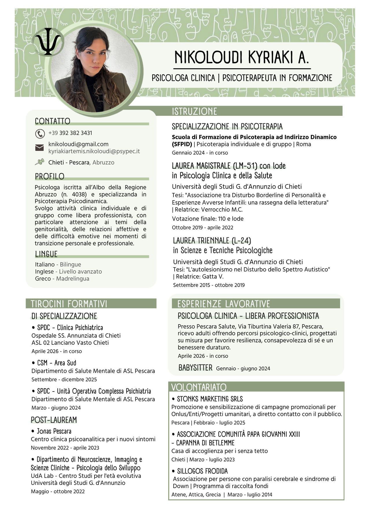 Dopo la laurea magistrale con lode, sto completando la specializzazione in psicoterapia ad orientamento psicodinamico. Questo mi permette di offrire percorsi più approfonditi e attenti alla complessità di ogni persona. Valuto con cura il funzionamento psicologico e gli aspetti della personalità, integrando una visione che considera la persona nella sua interezza.